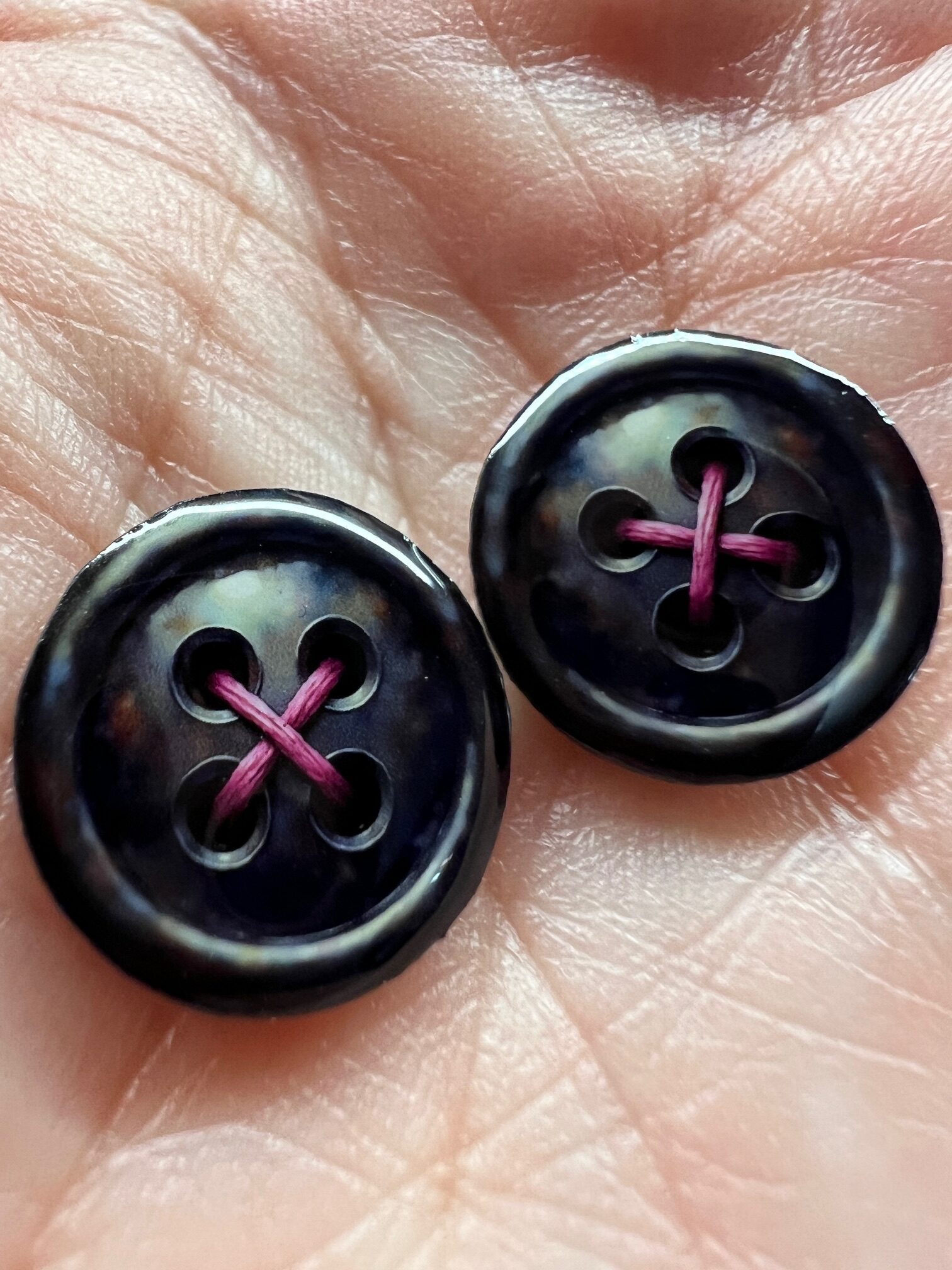 Button Eyes bring a bold little dose of dark whimsy to your doll’s look. Inspired by classic sewn buttons with a subtle wink to that beloved button-eyed storybook aesthetic, this design features a glossy black finish with vivid magenta thread detail for a quirky, slightly eerie touch that still feels polished and chic.